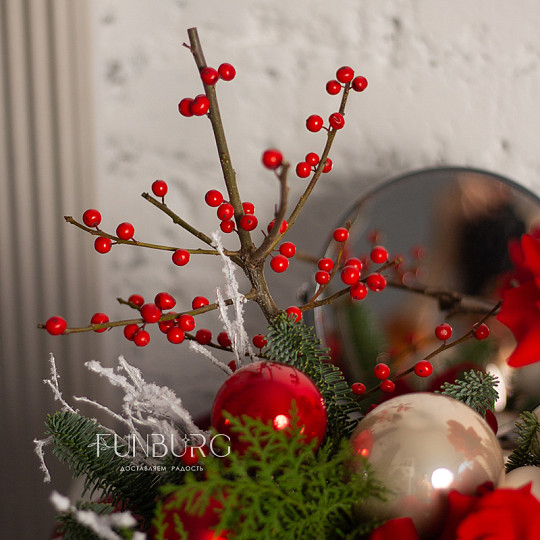 Состав: Красные розы Nina, Илекс, Нобилис, Заснеженные веточки, Ёлочный шар, стекло (2-2,5 см)