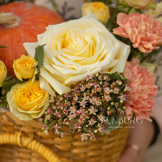Состав: Декоративная тыква, Сортовые розы (Эквадор), Кустовые розы, Сортовая гвоздика (диантус), Матрикария (кустовая ромашка), Лимониум, Пшеница, Седум