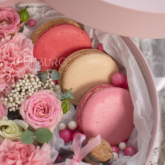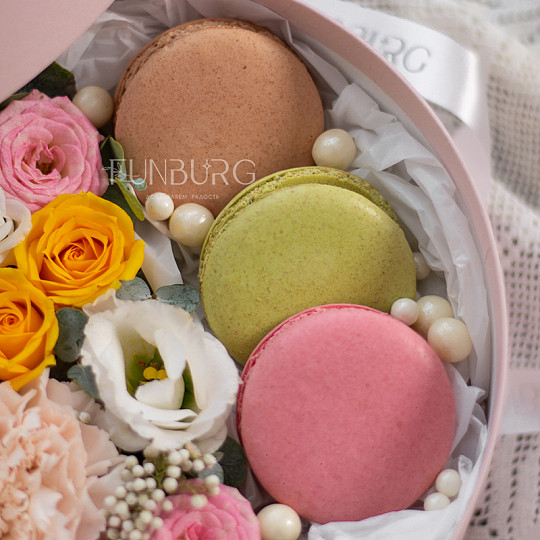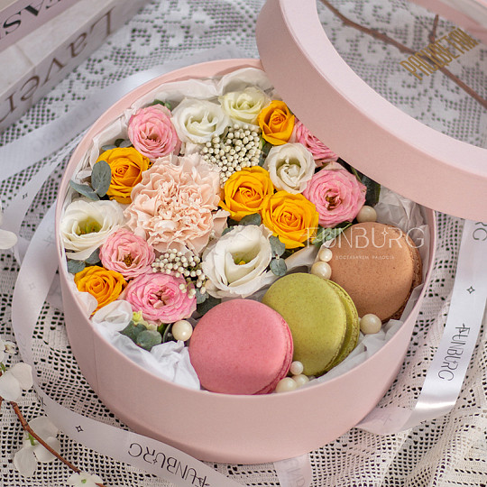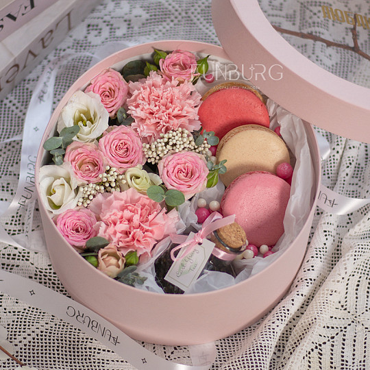 Состав: Кустовые розы, Сортовая гвоздика (диантус), Эустома, Эвкалипт, Озотамнус, «Макарон»