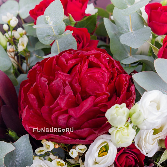 - в комбинациях с другими цветами, особенно великолепно смотрятся букеты роза-пион.