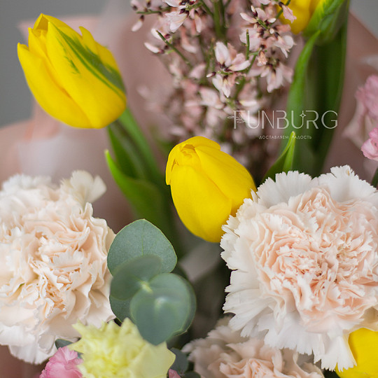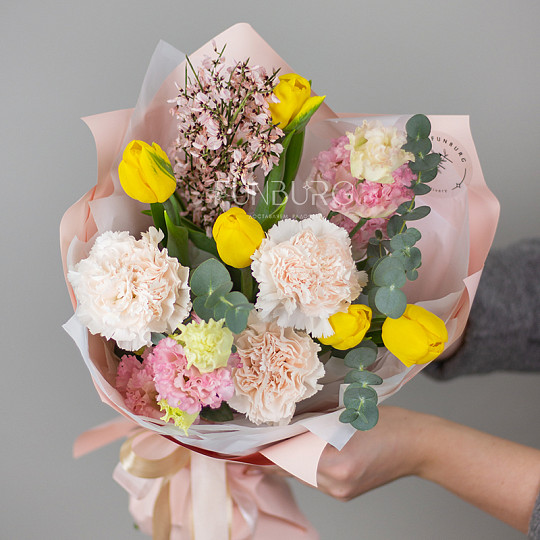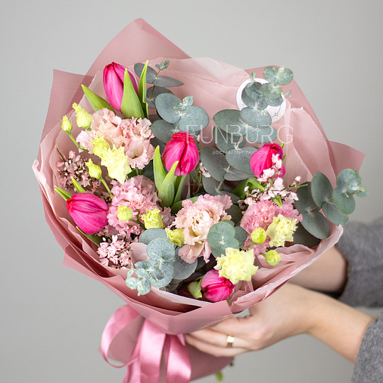 Состав: Тюльпаны, Эустома, Сортовая гвоздика (диантус), Джениста, Эвкалипт