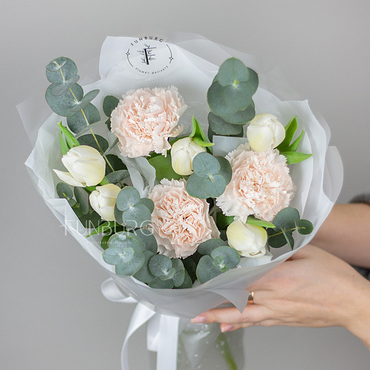 Состав: Тюльпаны, Сортовая гвоздика (диантус), Эвкалипт