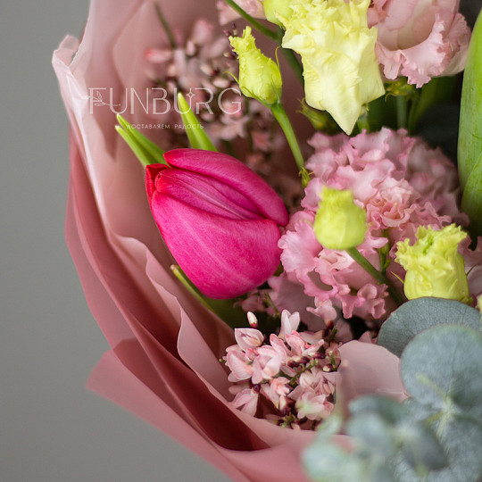 Состав: Тюльпаны, Эустома, Эвкалипт, Джениста