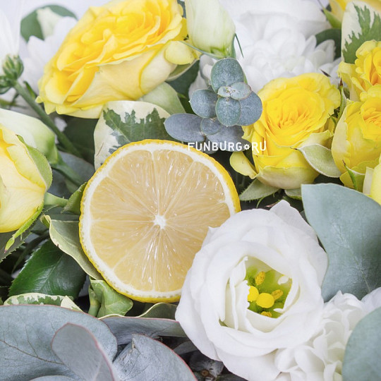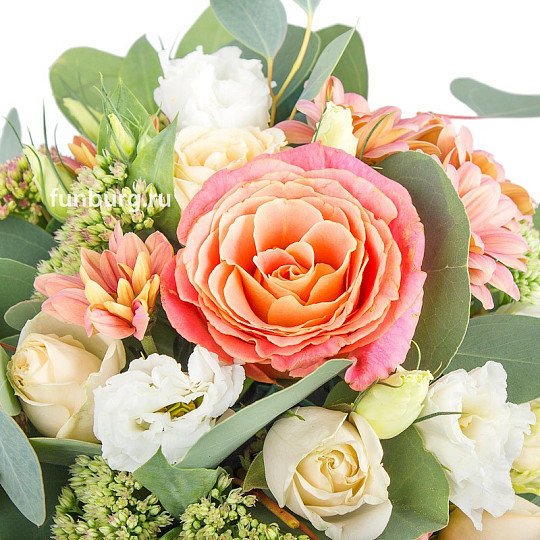 Состав: Кустовые розы, Эустома, Кустовые хризантемы, Гвоздика «Грин Трик», Эвкалипт, Питтоспорум