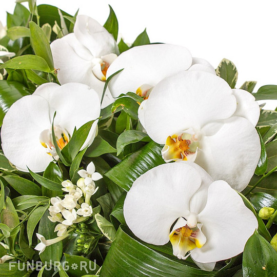 Состав: Орхидея (ветка), Орхидея дендробиум, Бувардия, Аспидистра, Рускус, Итальянский рускус