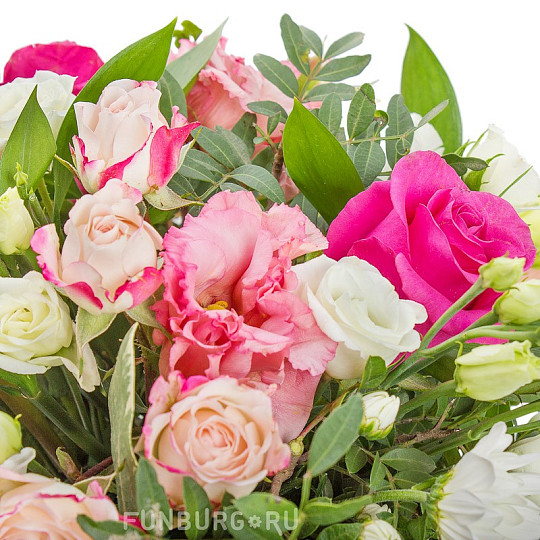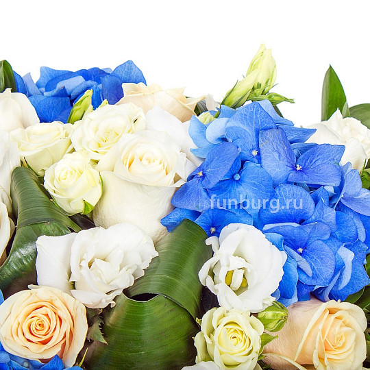 Состав: Гортензия, Розы (60 см), Кустовые розы, Эустома, Берграс, Рускус, Аспидистра, Папоротник