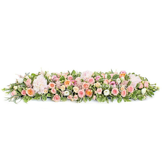 Состав: Кустовые розы, Пионы, Пионовидные розы, Эустома, Астильба, Питтоспорум, Эвкалипт