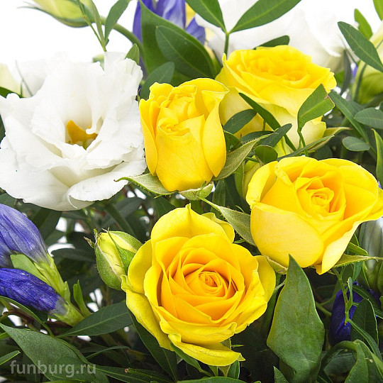 Состав: Кустовые розы, Эустома, Фисташка, Солидаго, Гентиана