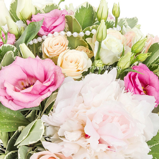 Состав: Эустома, Кустовые розы, Пионы, Питтоспорум, Рускус