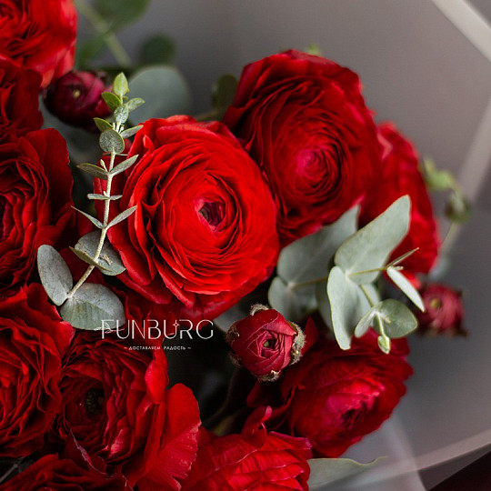 Состав: Ранункулюс, Кустовые пионовидные розы «Бомбастик», Эустома, Душистый горошек, Эвкалипт