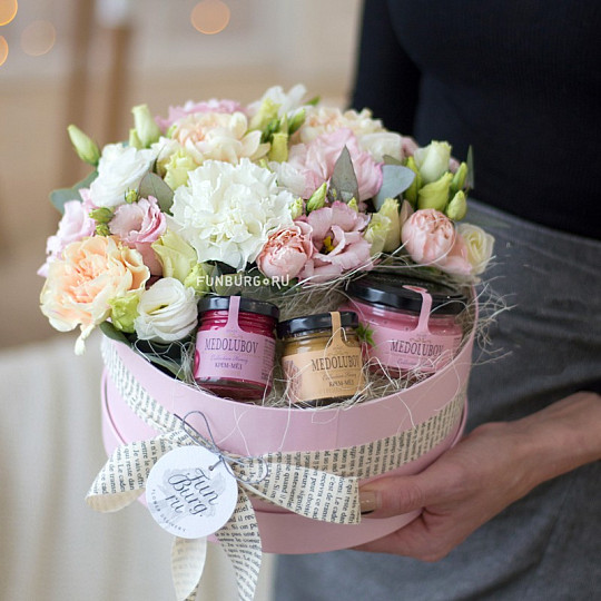 Состав: Гортензия, Пионовидные розы, Кустовые розы, Эустома, Розы (50-60 см), Кустовые хризантемы, Эвкалипт