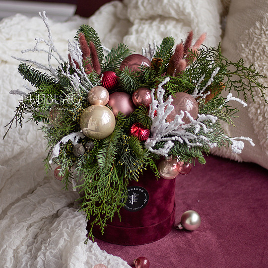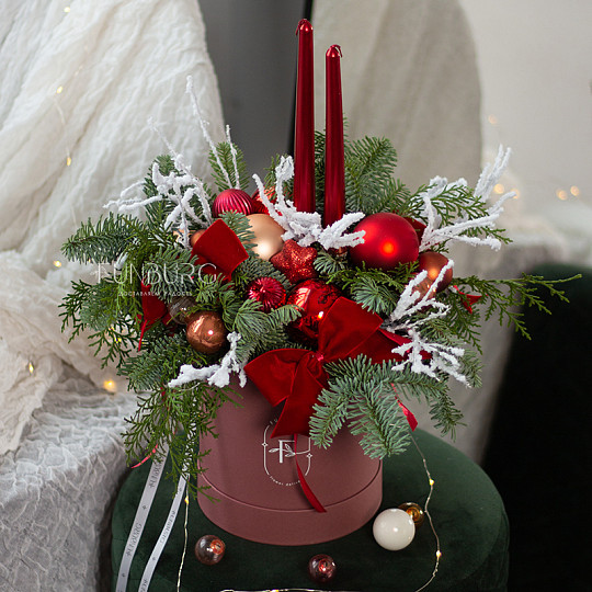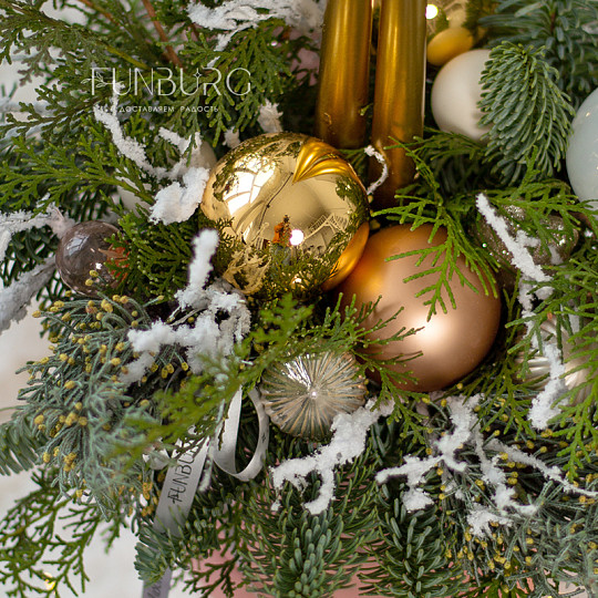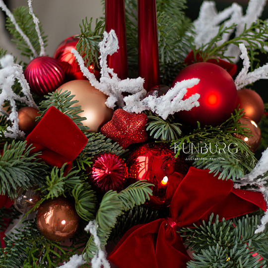 Состав: Туя, Нобилис, Елочная игрушка, стекло (⌀ 6 см), Елочная игрушка, стекло (⌀ 2,5-3,5 см), Заснеженные веточки, Свеча, Бархатный бант