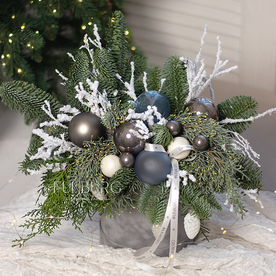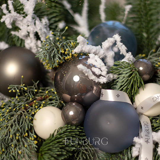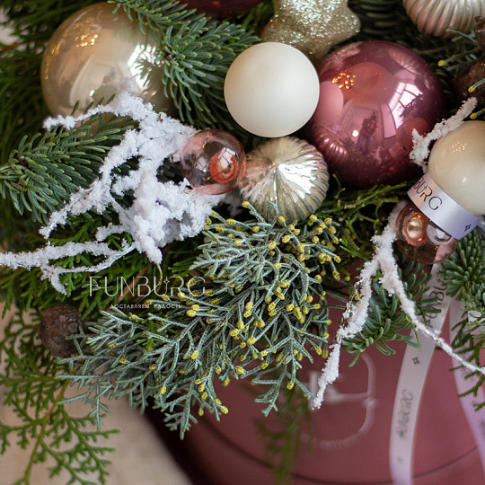 Состав: Туя, Нобилис, Елочная игрушка, стекло (⌀ 6 см), Елочная игрушка, стекло (⌀ 2,5-3,5 см), Заснеженные веточки