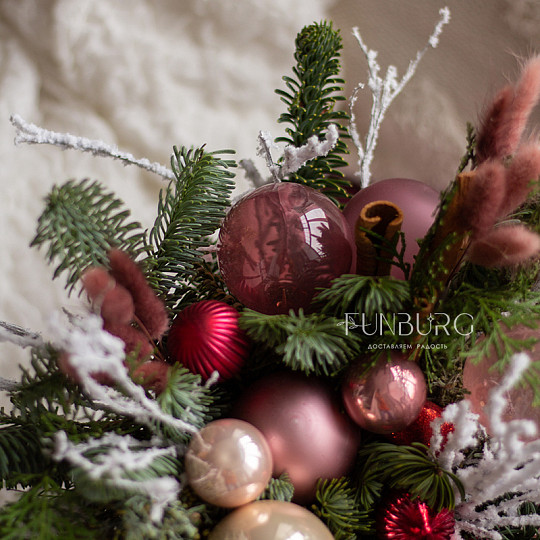 Состав: Туя, Нобилис, Елочная игрушка, стекло (⌀ 6 см), Елочная игрушка, стекло (⌀ 2,5-3,5 см), Заснеженные веточки, Лагурус (зайцехвост), Палочка корицы