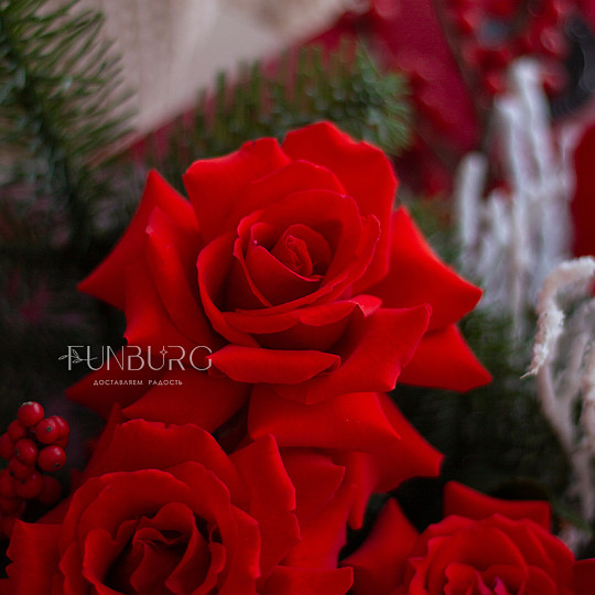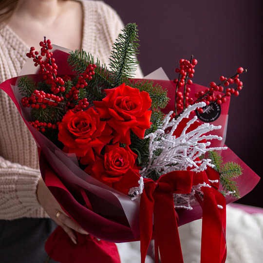 Состав: Красные розы Nina, Илекс, Нобилис, Заснеженные веточки, Бархатный бант