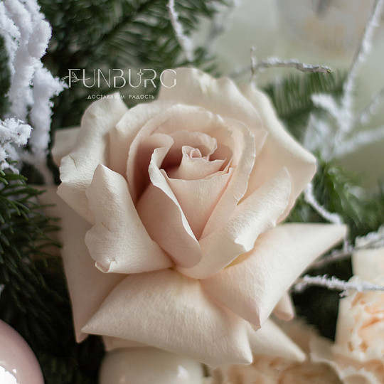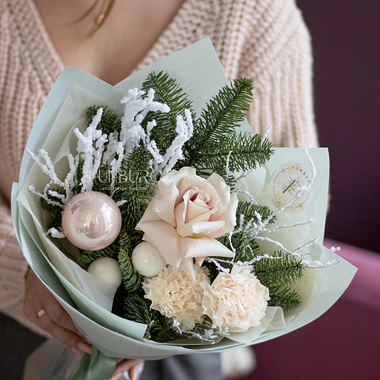 Состав: Французские розы Quicksand, Сортовая гвоздика (диантус), Нобилис, Заснеженные веточки, Ёлочная игрушка, стекло (6 см), Елочная игрушка, стекло (⌀ 2,5-3,5 см)