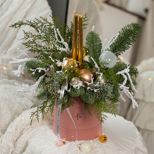 Состав: Туя, Нобилис, Елочная игрушка, стекло (⌀ 6 см), Елочная игрушка, стекло (⌀ 2,5-3,5 см), Заснеженные веточки, Свеча