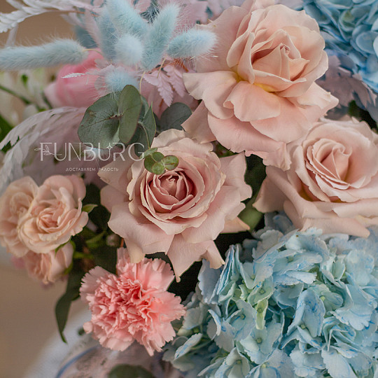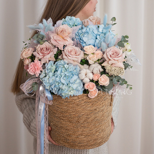 Состав: Сортовые розы (Эквадор), Гортензия, Сортовая гвоздика (диантус), Кустовые пионовидные розы «Бомбастик», Озотамнус, Лагурус (зайцехвост), Хлопок, Альстромерии, Эвкалипт, Стабилизированная зелень (папоротник, туя и т.д.)