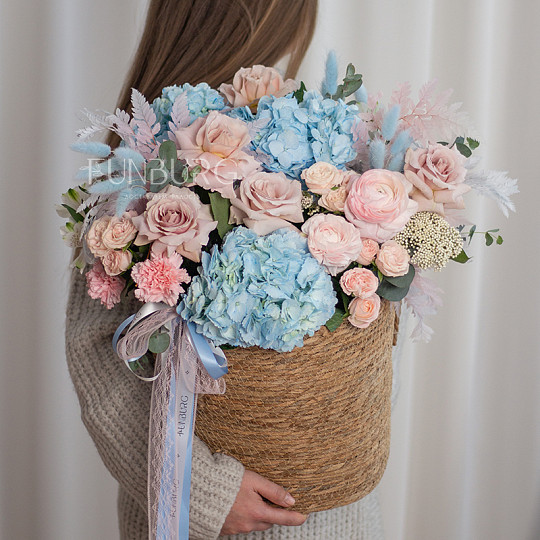 Состав: Сортовые розы (Эквадор), Гортензия, Сортовая гвоздика (диантус), Кустовые пионовидные розы «Бомбастик», Ранункулюс, Лагурус (зайцехвост), Озотамнус, Альстромерии, Эвкалипт, Стабилизированная зелень (папоротник, туя и т.д.)