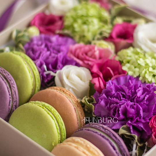 Состав: Эустома, Сортовая гвоздика (диантус), Вибурнум, Питтоспорум, «Макарон»