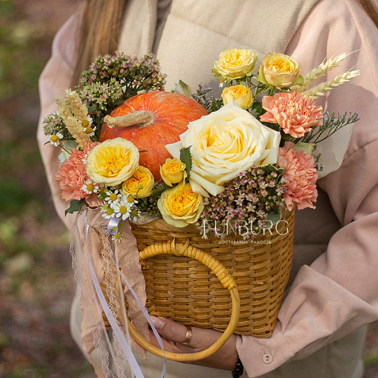 Состав: Декоративная тыква, Сортовые розы (Эквадор), Кустовые розы, Сортовая гвоздика (диантус), Матрикария (кустовая ромашка), Лимониум, Пшеница, Седум
