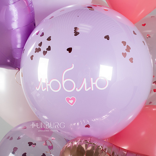 Состав: Цветной шар Bubble с надписью, Воздушные шары «Chrome» (ассорти), Из фольги без рисунка, Латексный без рисунка, Латексный с конфетти, Груз ручной работы (под цвет шариков), «Пакет для транспортировки» (стандартный)