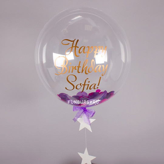 Состав: Шар Bubble с конфетти и надписью, Маленький латексный шар 5" с воздухом, Коробка для шаров 51*37*42