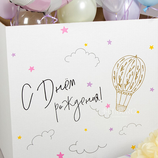 Состав: Шарик из фольги «Карамель» (светло-розовый), Шарик из фольги «Карамель» (сиреневый), Шарик из фольги «Карамель» (светло-желтый), Гелиевые шары без рисунка «Mini» 10″ (ассорти пастель), Маленький латексный шар 5", Коробка для шаров 60×60×60, Наклейка на коробку 60×60×60 см, Оформление коробки лентами/помпоном, Груз ручной работы (под цвет шариков)