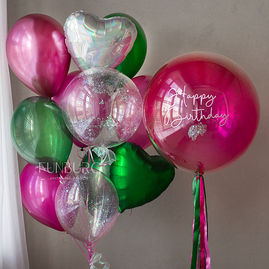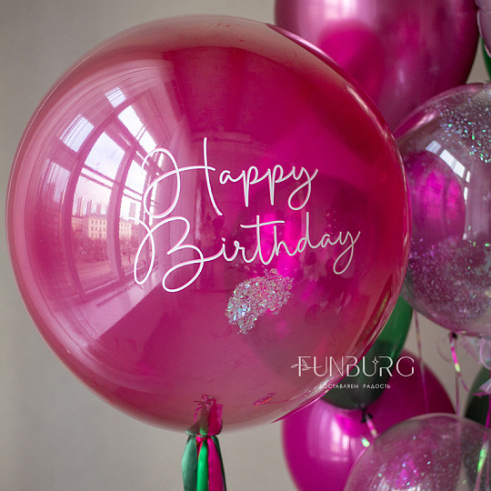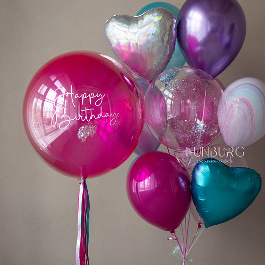 Состав: Стеклянный шар с надписью и декором 24″, Шар Bubble с конфетти, Из фольги без рисунка, Воздушные шары «Супер Агаты», Воздушные шары «Chrome» (ассорти), Латексный без рисунка, Груз ручной работы (под цвет шариков), «Пакет для транспортировки» (большой)