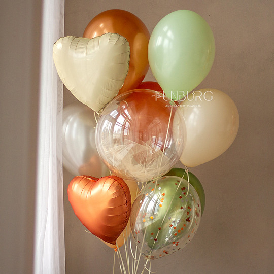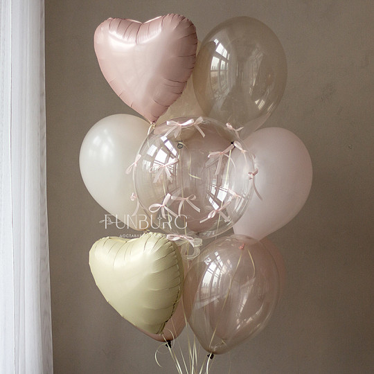 Состав: Шар Bubble с бантиками, Латексный без рисунка, Шары дизайнерских оттенков, Воздушные шары «Silk» (шёлк), Груз ручной работы (под цвет шариков), «Пакет для транспортировки» (стандартный)