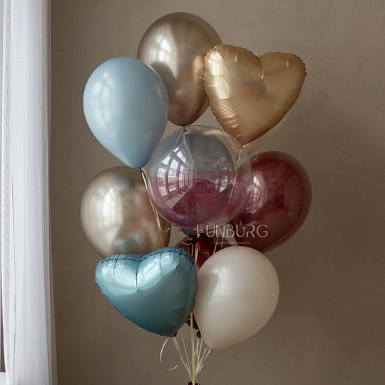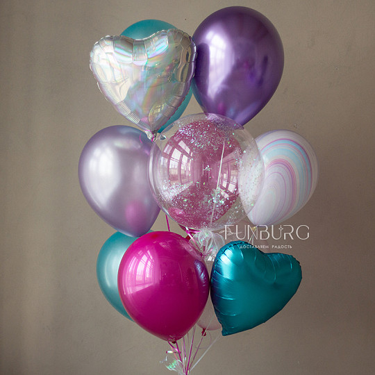 Состав: Шар Bubble с конфетти, Шар из фольги «Сердце с переливами (перламутр)», Из фольги без рисунка, Латексный с конфетти, Шары дизайнерских оттенков, Воздушные шары «Chrome» (ассорти), Латексный без рисунка, Груз ручной работы (под цвет шариков), «Пакет для транспортировки» (большой)