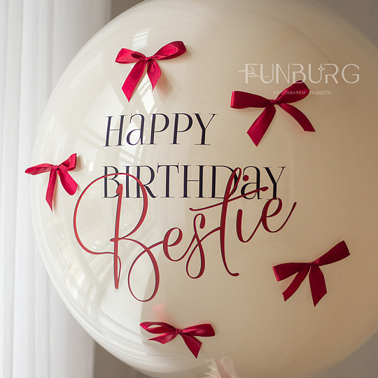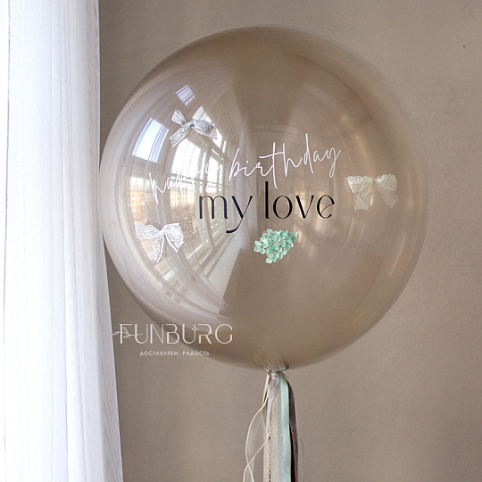 Состав: Стеклянный шар с надписью и декором 24″, Шар Bubble с бантиками, Латексный без рисунка, Добавить бантик к шарику, Латексный с конфетти, Груз ручной работы (под цвет шариков), «Пакет для транспортировки» (стандартный)