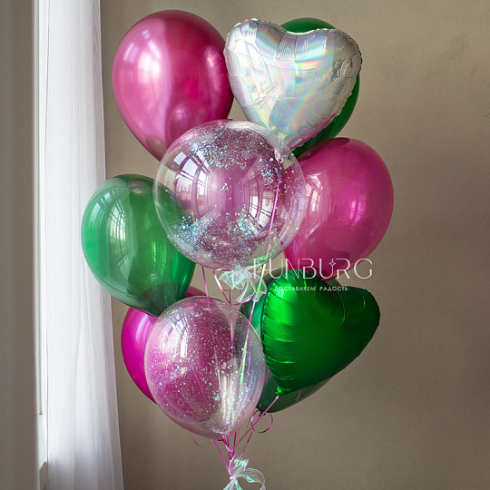 Состав: Из фольги без рисунка, Латексный с конфетти, Латексный без рисунка, Груз ручной работы (под цвет шариков), «Пакет для транспортировки» (стандартный)