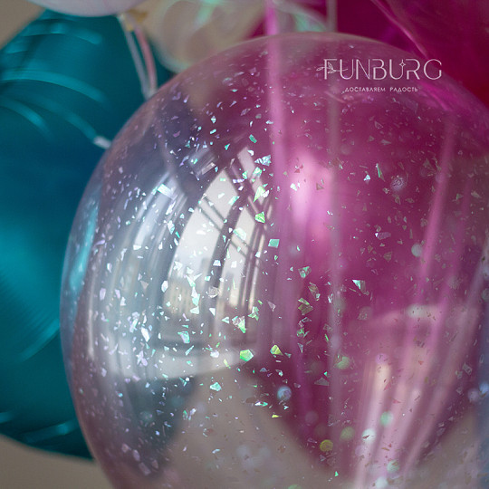 Состав: Шар Bubble с конфетти, Воздушные шары «Chrome» (ассорти), Из фольги без рисунка, Латексный без рисунка, Груз ручной работы (под цвет шариков), «Пакет для транспортировки» (большой)
