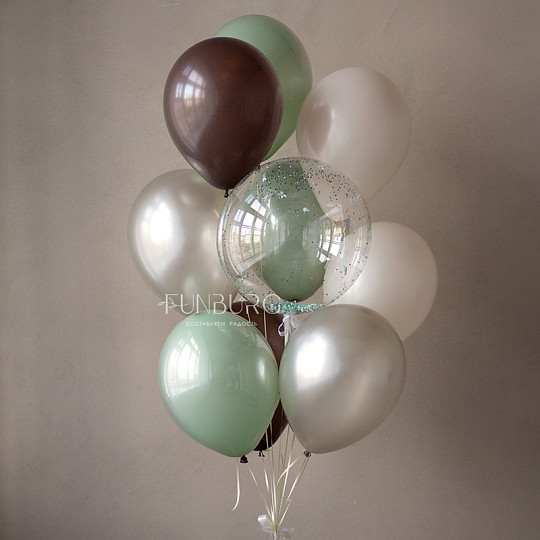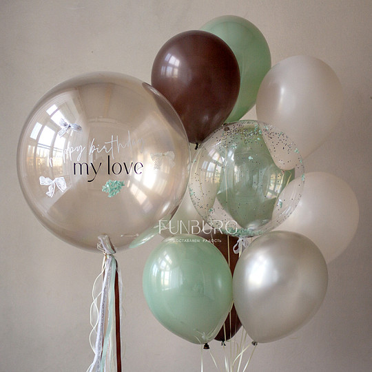 Состав: Шар Bubble с конфетти, Воздушные шары «Silk» (шёлк), Латексный с конфетти, Латексный без рисунка, Из фольги без рисунка, Шары дизайнерских оттенков, Груз ручной работы (под цвет шариков), «Пакет для транспортировки» (большой)