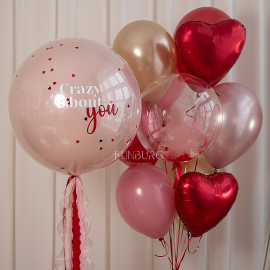 Состав: Стеклянный шар с надписью и декором 24″ (Silk), Шар Bubble с перьями/фатином, Воздушные шары «Silk» (шёлк), Воздушные шары «Супер Агаты», Воздушные шары «Chrome» (ассорти), Из фольги без рисунка, Шар из фольги «Сердце с переливами (перламутр)», Груз ручной работы (под цвет шариков), «Пакет для транспортировки» (стандартный), «Пакет для транспортировки» (большой)