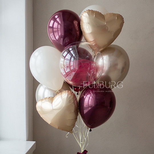 Состав: Шар Bubble с конфетти, Шар из фольги «Сердце с переливами (перламутр)», Из фольги без рисунка, Латексный с конфетти, Шары дизайнерских оттенков, Воздушные шары «Chrome» (ассорти), Латексный без рисунка, Воздушные шары «Silk» (шёлк), Воздушные шары «Супер Агаты», Груз ручной работы (под цвет шариков), «Пакет для транспортировки» (большой)