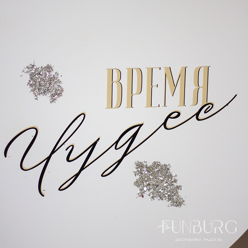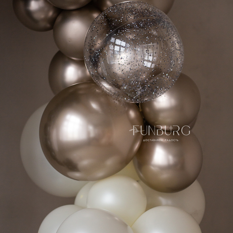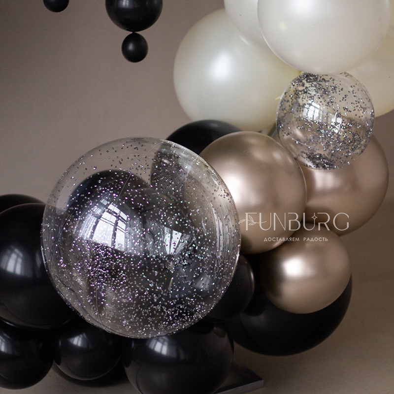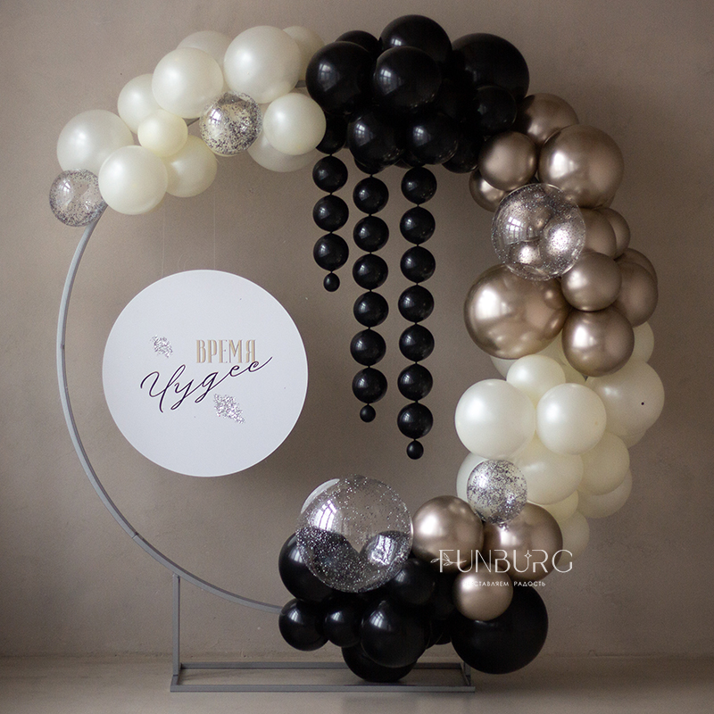 Изысканная круглая арка-фотозона, декорированная асимметричной разнокалиберной гирляндой из мерцающих и матовых шаров, дополненных бусами из шариков, кристальными шарами с конфетти и кругом с надписью (ее можно сделать любой) станет идеальным дополнением оформления самого стильного праздника. Она подойдет как для украшения Нового года, так и для вечеринки по поводу любого другого важного события!