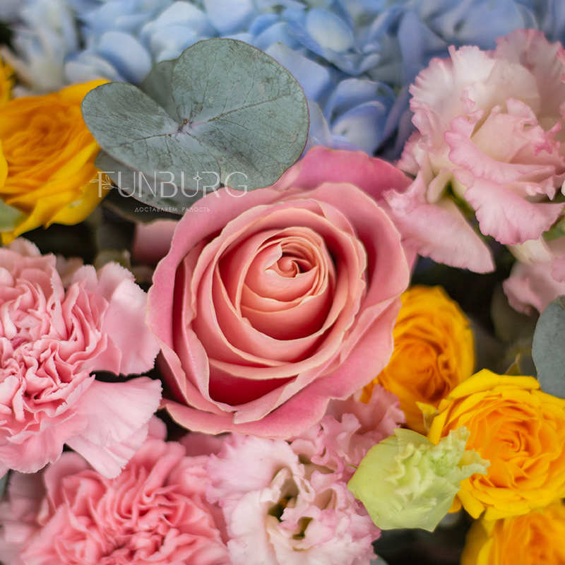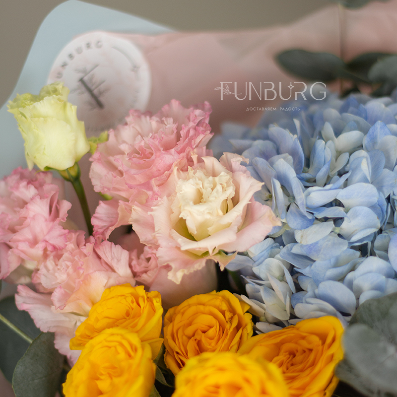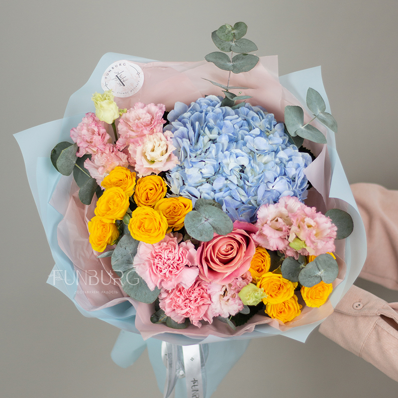 На фотографиях лишь пример, состав будет отличаться для каждого конкретного букета – это ассорти сезонных цветов в лазурной, теплой нежно-розовой и лимонной гамме гамме. Летом в букете могут оказаться пионы или маттиола, а зимой и весной – ранункулюсы и тюльпаны. Вы всегда можете сообщить нам о своих пожеланиях, и мы обязательно их учтем.