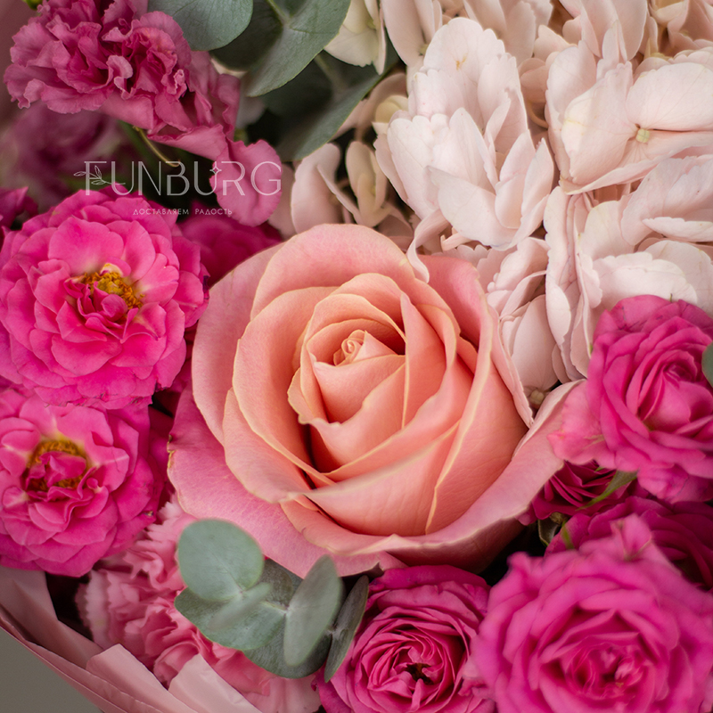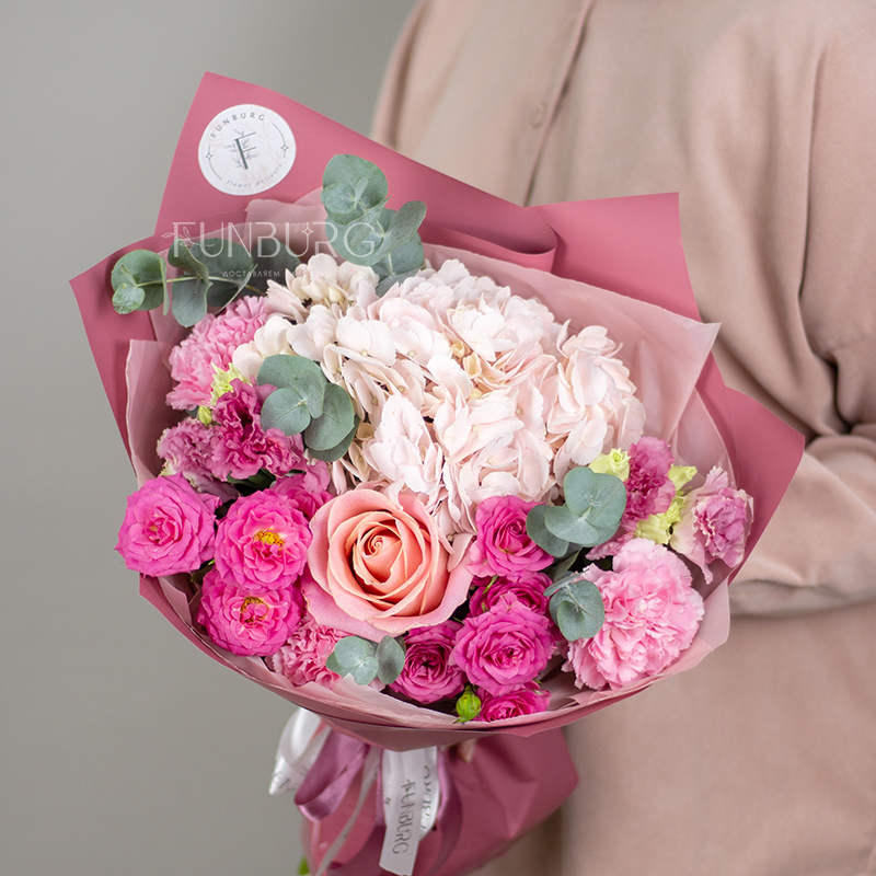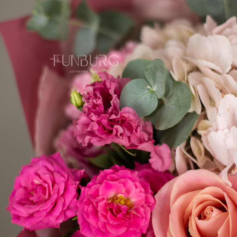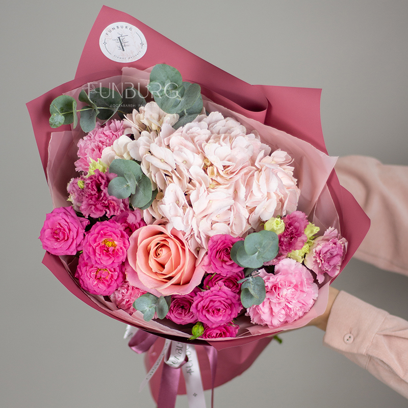 На фотографиях лишь пример, состав будет отличаться для каждого конкретного букета – это ассорти сезонных цветов в оттенках розового и фуксии. Летом в букете могут оказаться пионы или маттиола, а зимой и весной – ранункулюсы и тюльпаны. Вы всегда можете сообщить нам о своих пожеланиях, и мы обязательно их учтем.