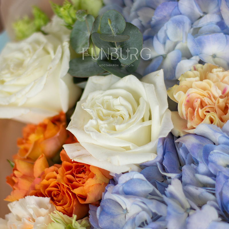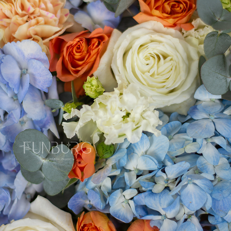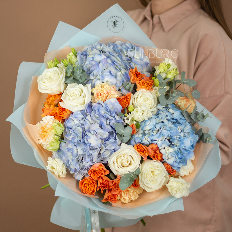 Большой нежный букет из свежих сезонных цветов в лазурно-белой гамме с добавлением солнечного оранжевого – удобный и красивый способ порадовать самых близких!