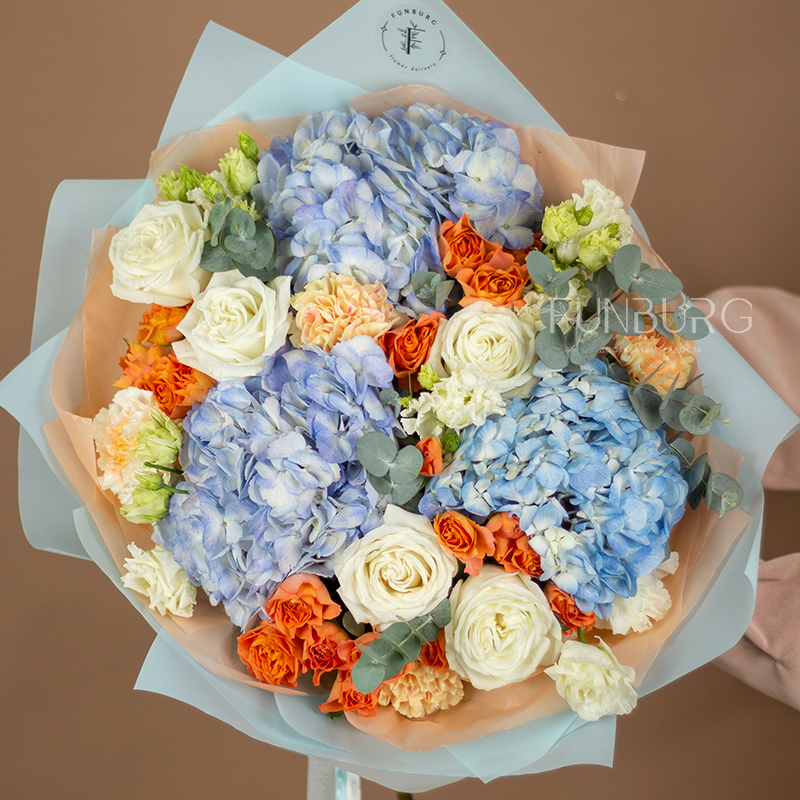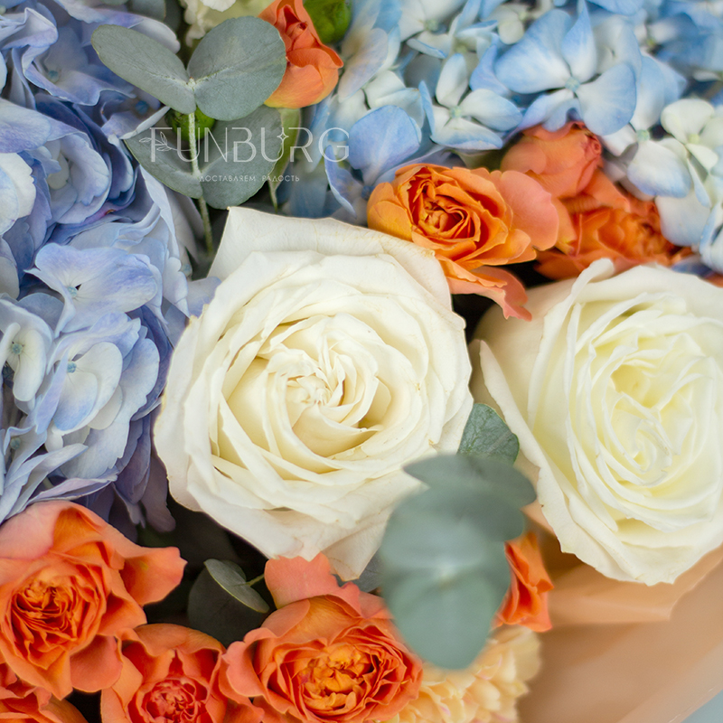 На фотографиях лишь пример, состав будет отличаться для каждого конкретного букета – это ассорти сезонных цветов в лазурно-белой и оранжевой гамме. Летом в букете могут оказаться пионы или маттиола, а зимой и весной – ранункулюсы и тюльпаны. Вы всегда можете сообщить нам о своих пожеланиях, и мы обязательно их учтем.