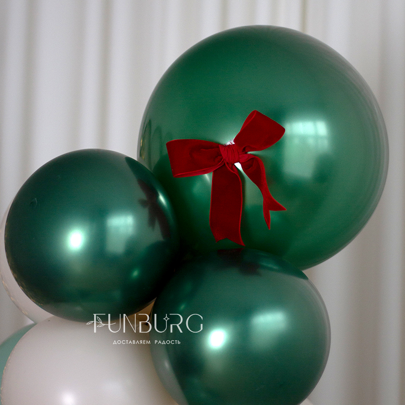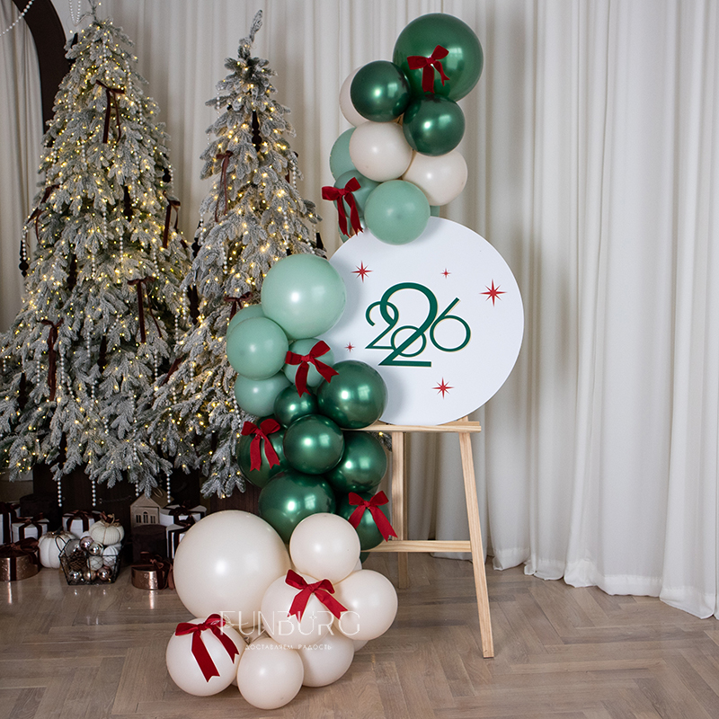 Стильная небольшая фотозона с мольбертом, разнокалиберной гирляндой из шариков праздничного насыщенного оттенка зеленого, кремового и мятного с добавлением нарядных бархатных бантиков и "холстом", на который можно нанести любую надпись, идеально подходит для небольшого новогоднего оформления.