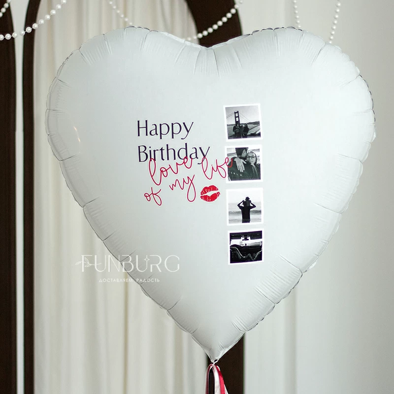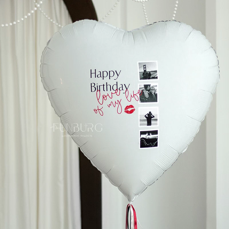 Огромное белоснежное сердце (его диаметр почти 1 метр!) из фольги с уникальным украшением в виде ваших фотографий и романтичной надписи станет незабываемым и очень трогательным подарком! Мы придумали дизайн расположения фотографий и надписи, а вам остается только выбрать из своего фотоархива самые ценные и подходящие снимки, придумать надпись (или использовать наш пример) - идеальная валентинка или просто сюрприз для близкого человека готовы!