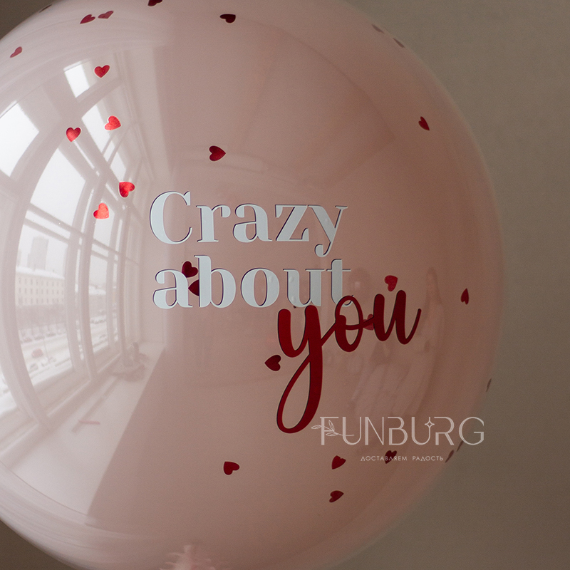 Большой зеркально-глянцевый шар нежнейшего пыльно-розового оттенка с контрастными красными сердечками, признанием (текст может быть любым) и шлейфом из ленточек. Для самых красивых и искренних поздравлений и признаний.