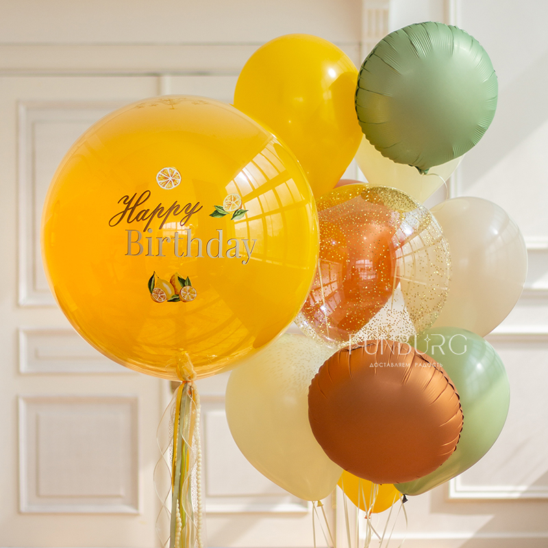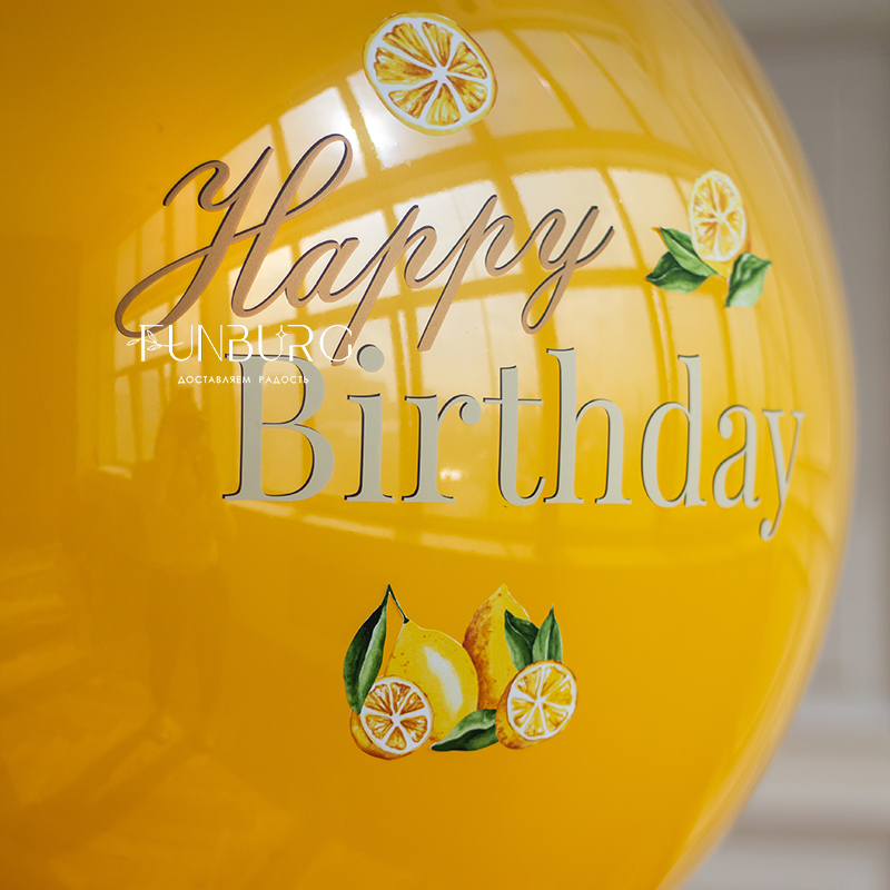 Большой зеркально-глянцевый сочный медово-желтый шар идеально подойдет для тематического праздника или в качестве подарка любителю всего лимонного и яркого! Мы украсили его тематическими наклейками-лимонами и шлейфом из ленточек в тон оформлению, и получилось невероятно эффектно!