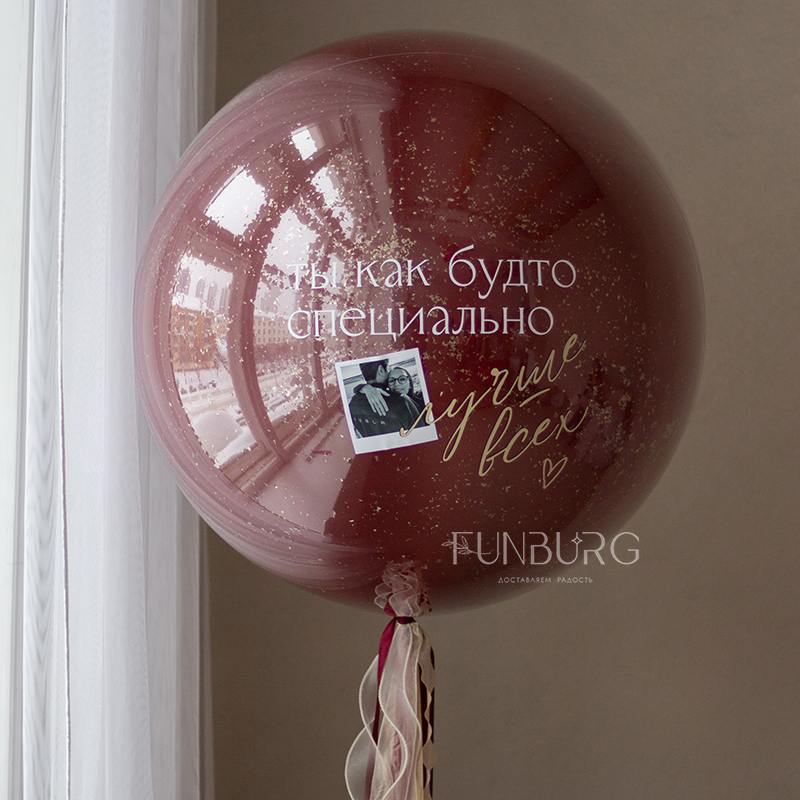 Большой глянцевый шар насыщенного винного оттенка и утонченным конфетти с вашей фотографией (ее нужно будет прислать нам на почту mail@funburg.ru) и надписью поможет красиво и необычно сказать, насколько особенным человеком для вас является получатель этого шарика. Надпись на шаре и оформление достаточно универсальны, поэтому он подойдёт как для нее, так и для него, для любого события или случая.