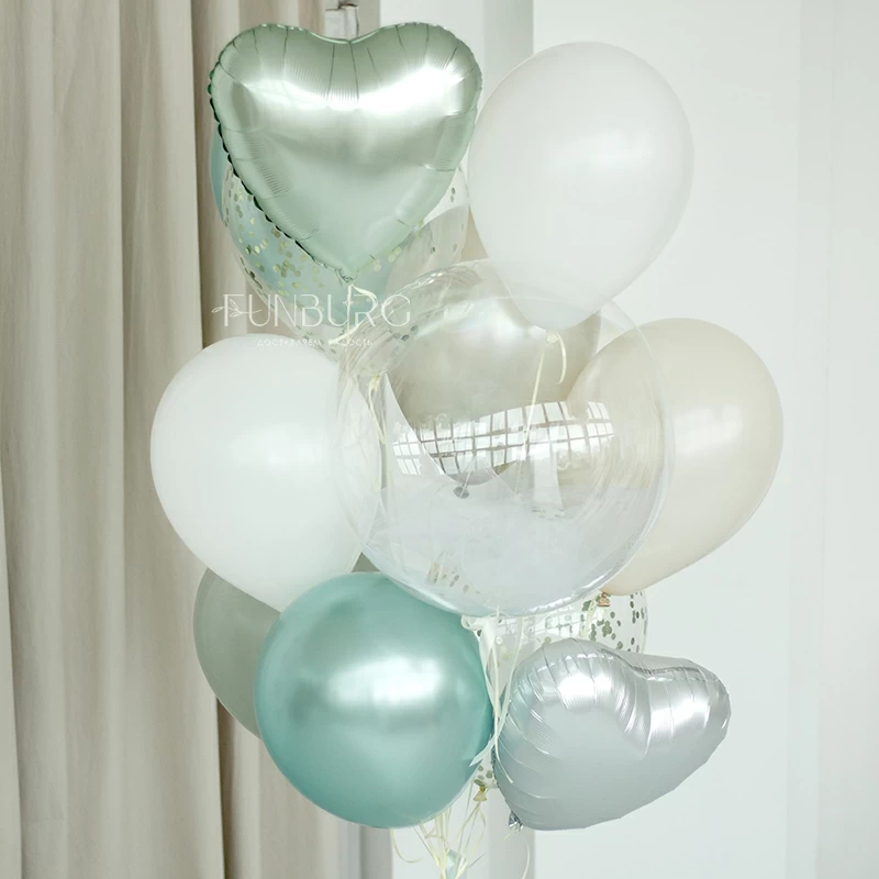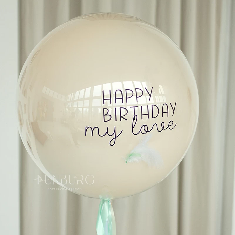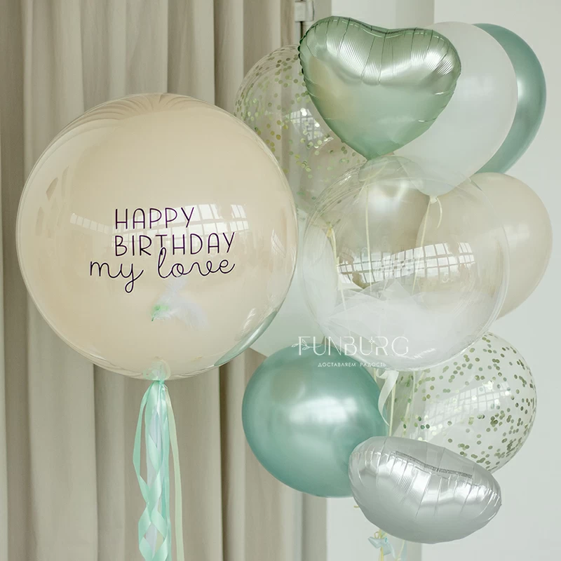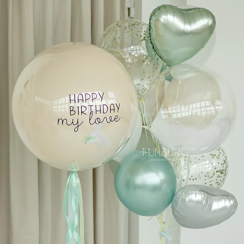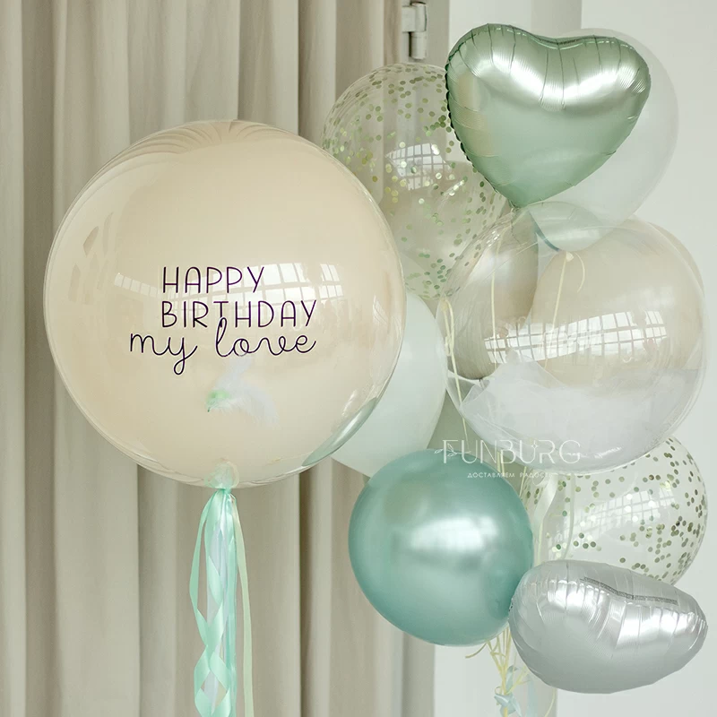 Большой зеркально-глянцевый шар нежнейшего кремового оттенка с лаконичной надписью (ее можно сделать любой), дополненный шлейфом из мятных лент и перышками. Шар можно дополнить идеально подходящей к нему связкой из шариков разных оттенков мятного и кремового, с шаром Bubble с облачком фатина внутри и сатиновыми сердцами. Состав набора вы можете менять по вашему желанию.