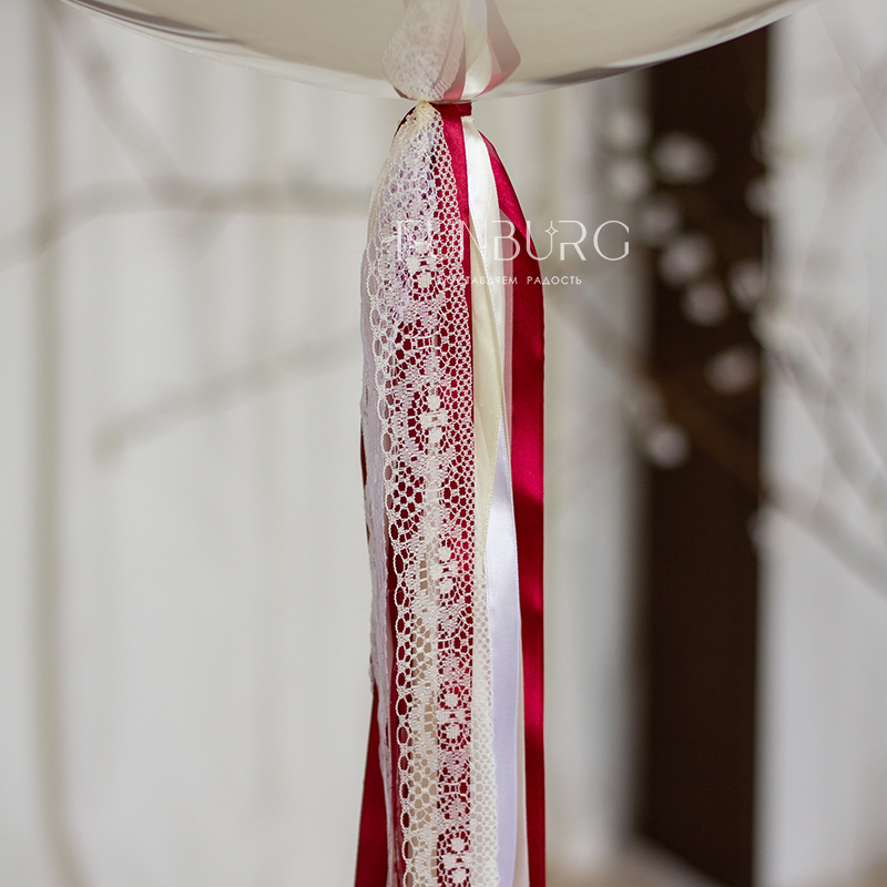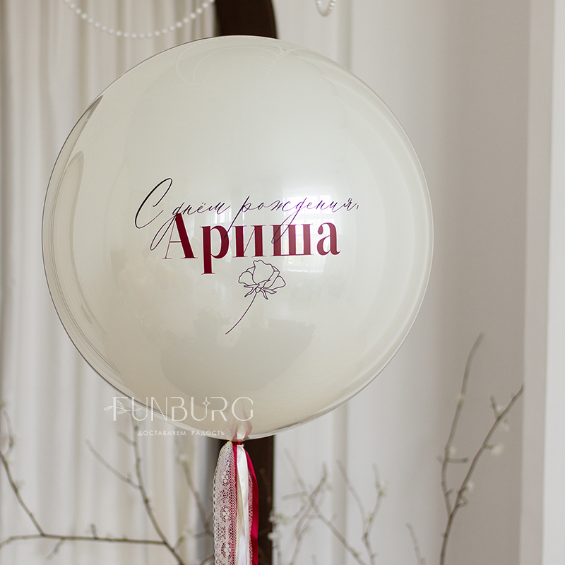 Большой зеркально-глянцевый шар нежнейшего мерцающего сливочно-белого оттенка с контрастной вишневой надписью (ее можно сделать любой), изящным цветком и шлейфом из лент разных текстур идеально подойдет для нежных и утонченных поздравлений.