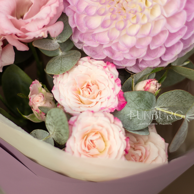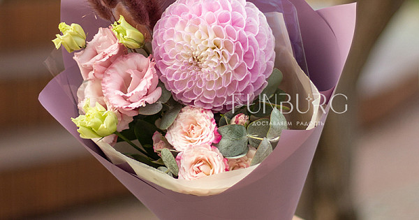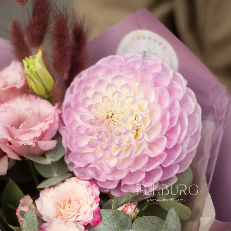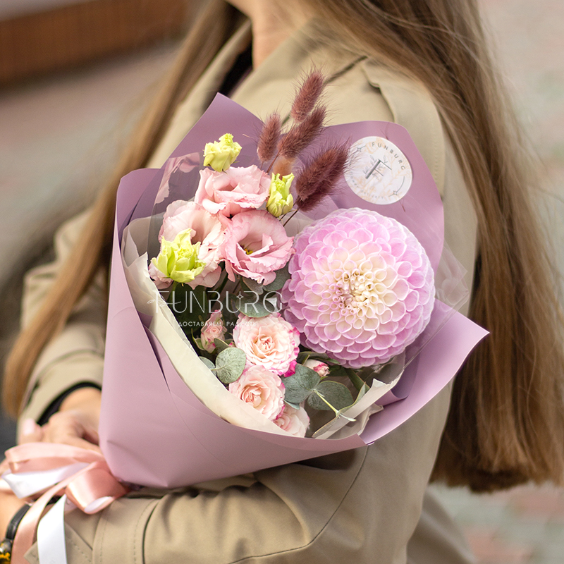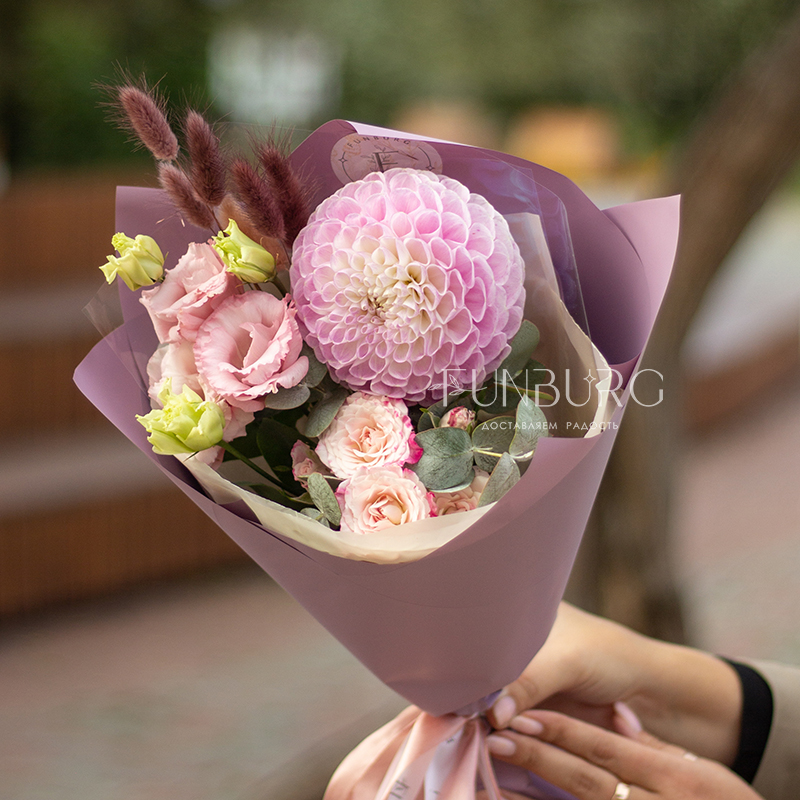 Небольшой букет-комплимент в красивой пыльно-лавандовой гамме с пышным бутоном георгины, кустовой розой, нежной эустомой и пушистыми веточками лагуруса. Идеален для маленьких летних и осенний сюрпризов.
